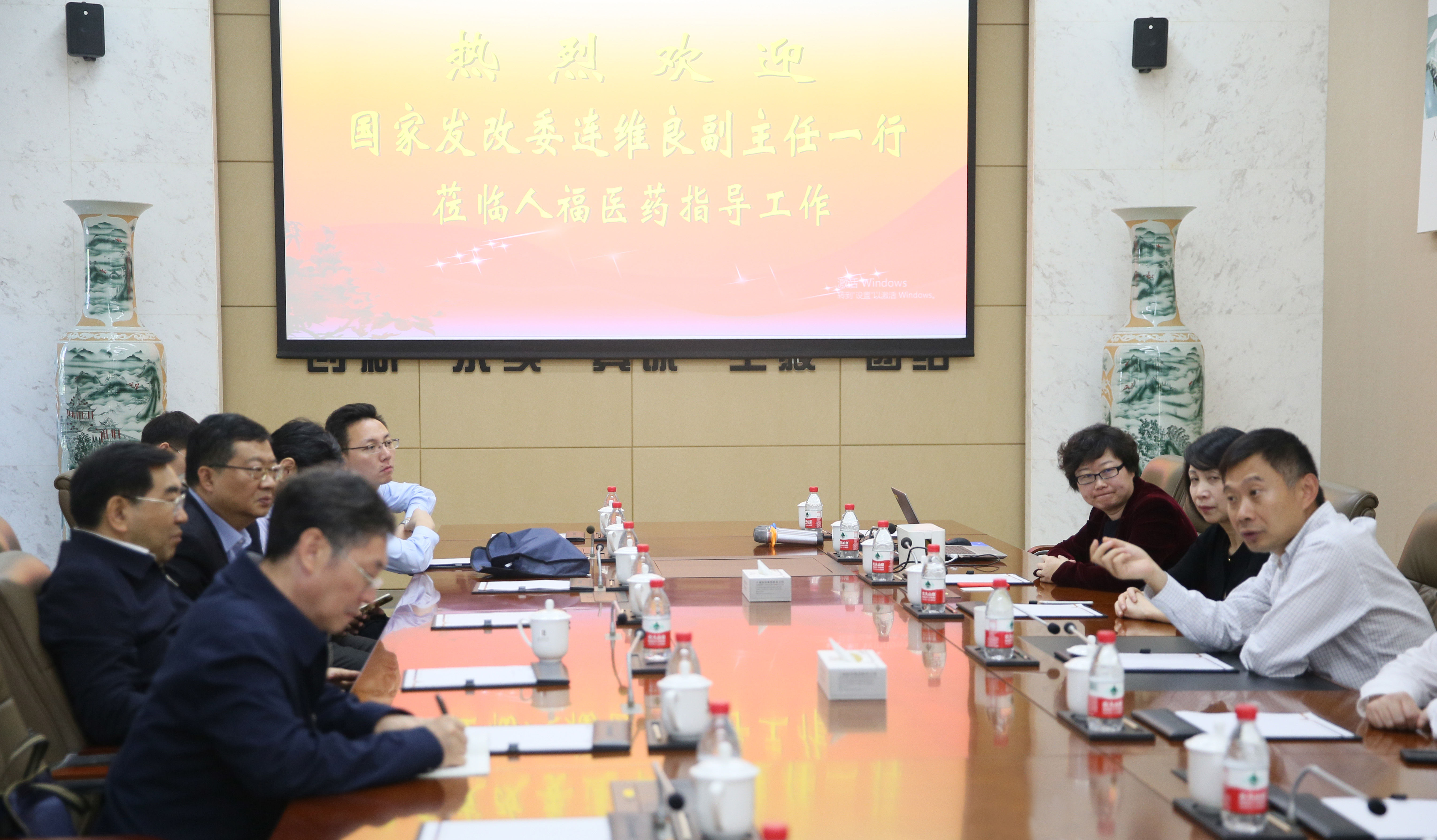 王学海董事长向连维良副主任介绍了集团的发展现状及重点产品研发生产情况,汇报了集团关于国家肿瘤诊断和治疗产业创新中心组建情况及民营企业融资现状。连维良副主任认真听取了王学海董事长的汇报后,对国家肿瘤诊断和治疗产业创新中心予以肯定,对民营企业融资现状提出了宝贵意见。